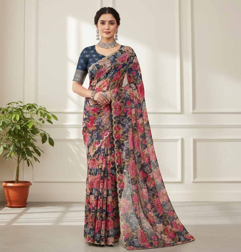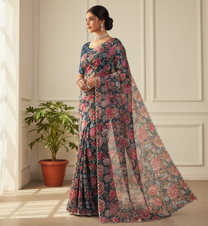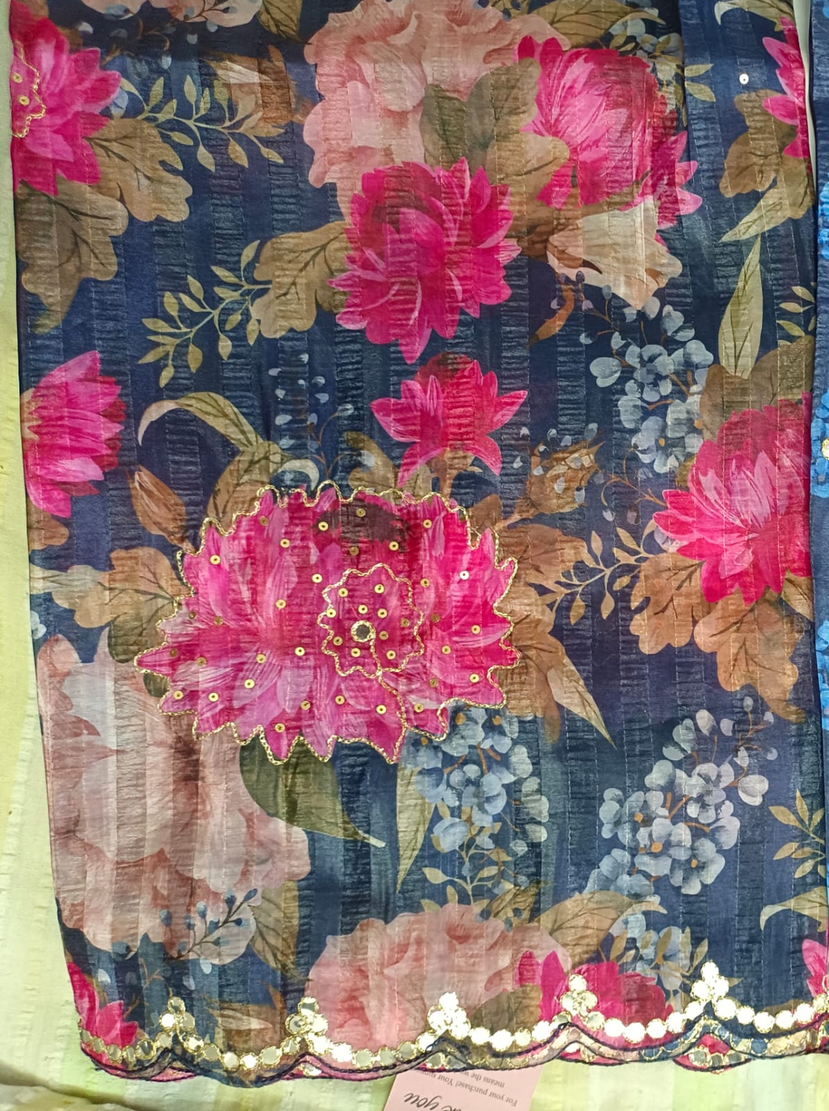 Saree fabric : Kashi organza pattan aari sequence mirror work border Saree
